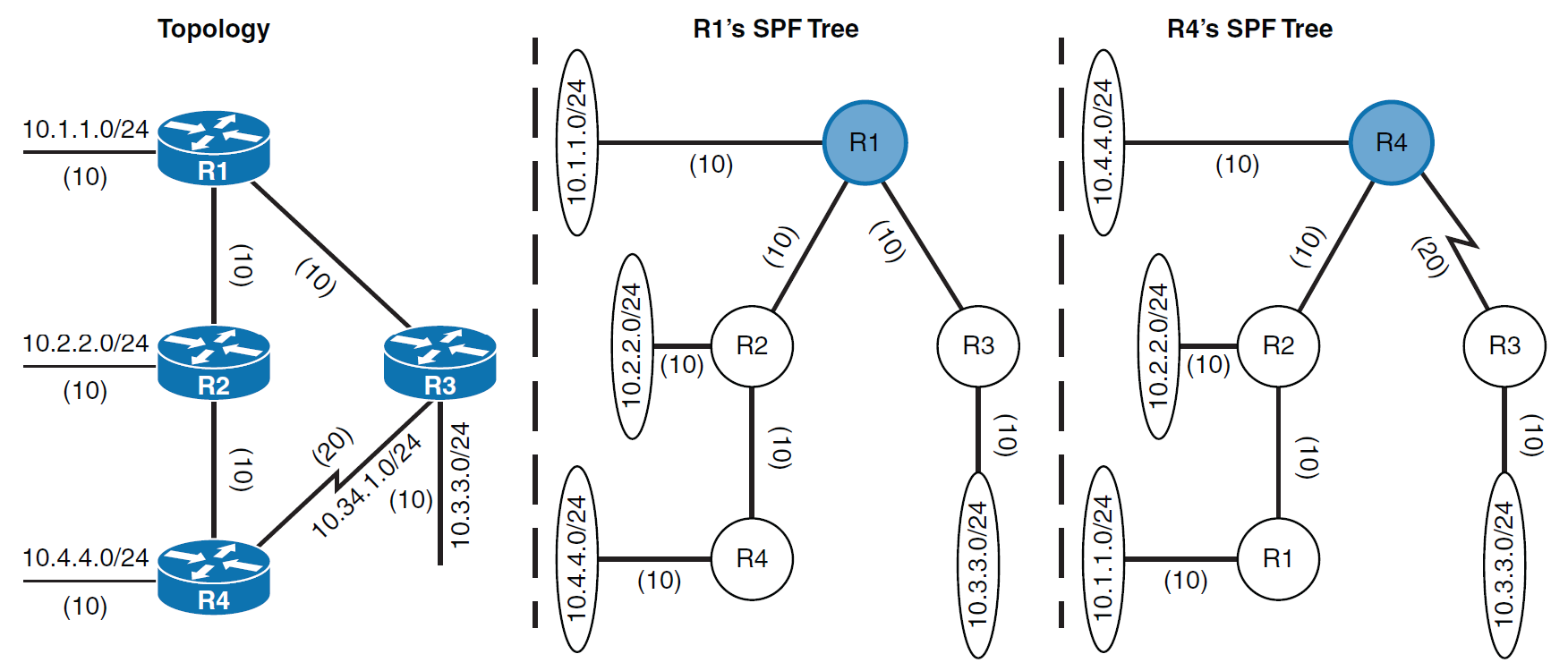 Therefore the SPT differs from each router. But the LSDB, used to create the SPT is identical. This ensures that the network is loop-free.